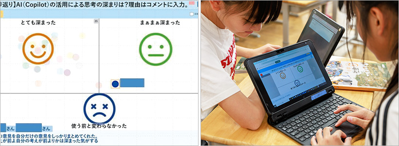そのほかに、道法先生と同じく[ポジショニング]もよく使いますが、今回は進捗確認に活用しました。1学期からの様子を見ていて、活動の進み具合を調整することに難しさを感じている子もいたからです。自分では遅れていることに気付けない子もいるので、他者のマーカも見られるようにしておき、集団の中で自分がどこに位置しているのかを意識できるようにしています。こうした意識のあり方は、机間指導だけではなかなか把握しきれないので、見取りに活用できるツールはありがたいです。子どもたちの今まで見えていなかったことが分かるようになったと実感しています。