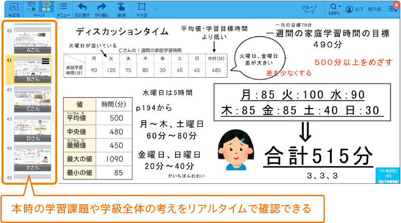 その後、[グループワーク]でクラス全員を同じグループに参加させました。[グループワーク]は友達の[発表ノート]にも書き込めるのでスムーズに議論できる上、画面横にクラス全員の[発表ノート]がずらりと並ぶので、必要な情報を選択する練習にもなります。参考にしたいと思った友達の[発表ノート]から必要な素材をもらい、貼りつけることも可能です。また、過去の先輩や隣のクラスの[発表ノート]を持ち込み、紹介できる点も便利です。このように、子どもたちが簡単につながれることが[グループワーク]をはじめとした『SKYMENU Cloud』の最大のメリットだと感じます。