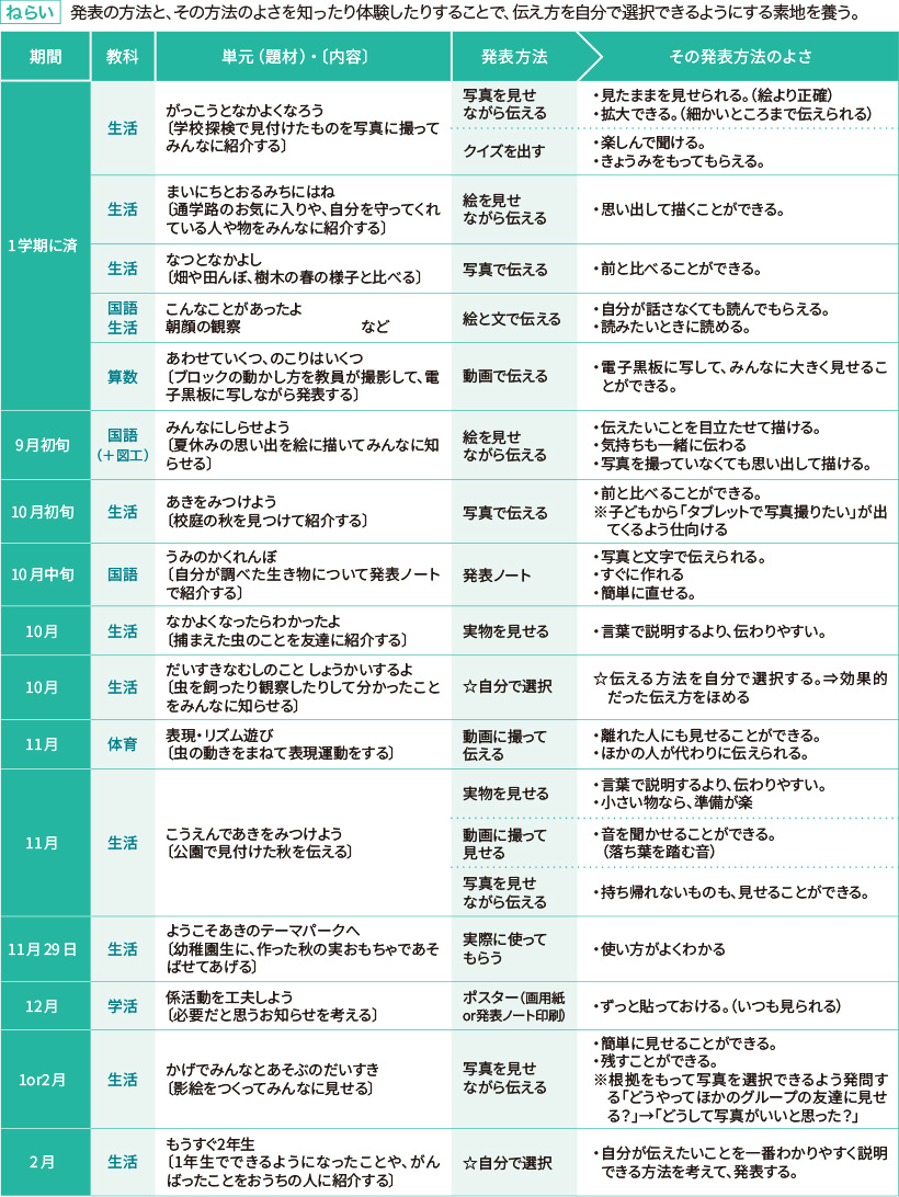 3学期の最後には1年間のまとめとして、生活「もうすぐ2年生」の学習で、「できるようになったこと発表会」を行います。1年生で頑張ったことや成果を保護者に発表する場です。それまでに、自分が伝えたい内容に合わせ、根拠を持って発表方法を選べるようにさせたいと考えています。