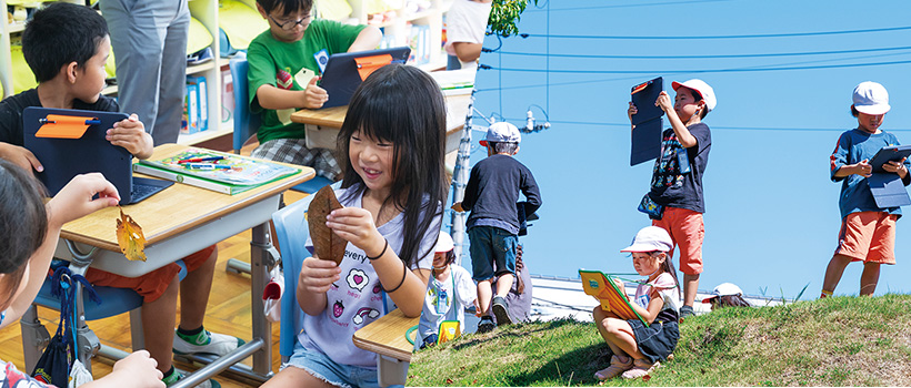今回の実践、生活「あきをみつけよう」では、校庭に「秋」を探しに行き、それぞれが思う方法で記録し、見つけた秋を友達と伝え合いました。子どもたちの主体性を引き出すために、導入は「今って秋? 夏?」といった問いからスタート。子どもたちのさまざまなつぶやきから、「じゃあ、外に確かめに行こう」と誘い、校庭に出る流れです。