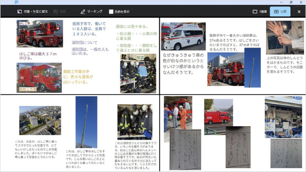ある程度制作が進んだころ、[画面比較]を使って4人の児童の画面を大型提示装置に映し出しました。写真をトリミングしたり重ねたりといった工夫を施している事例を紹介したかったからです。ほかにも、はしご車の高さを強調するために細長く切り取るなど、情報デザインを考えた上での工夫も見られました。またこのときは、作業で悩んでいる場合のみ大型提示装置を見るように指導しています。