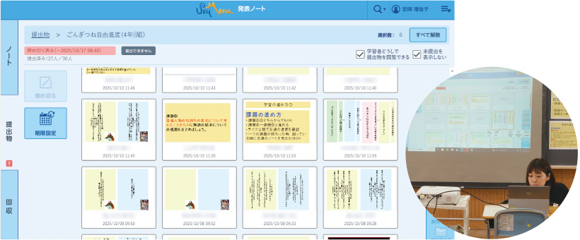 Microsoft Teamsで自由進度学習を行っていた頃は、課題の進捗をMicrosoft Excelにチェックし、後は名簿を手にあちこち回って机間指導をしていました。その際、苦手意識のある児童を優先してしまい、自分で学びを進められる児童への対応までを限られた時間内で十分に行うのは難しかったです。しかし、[ライブ公開提出箱]では全員のノートを一つの画面で確認できるので、サポートが必要な子をすぐに見つけて声をかけられます。また、自分で進められている児童に対しても、「なぜそう思うの?」と、さらに考えを深めるための問いかけができるようになりました。