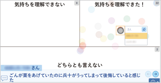 授業の最後には、どこまで考えを深められているかを確認するために[ポジショニング]を使い、「気持ちを理解できない」「理解できた」「どちらとも言えない」の3択でマーカを配置させました。コメント欄には必ず、その位置を選んだ理由を書かせるのがポイントです。その後、全員の考えを前に投影。考えを深められているかどうか気になっていた子や、思いもよらない場所にマーカを置いた子に声をかけるようにしました。