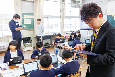 私は3年の担当を務める傍ら、数年前から大阪市の「学校教育ICT推進リーダー」を務めています。2024年度に本校で新たな取り組みが進み始めた頃、「もっと効果的なICT活用を広めたい」と校長に伝え、実践を重ねました。すると徐々に職員室でそうした話をする機会が増え、それに伴い活用率も上昇しました。