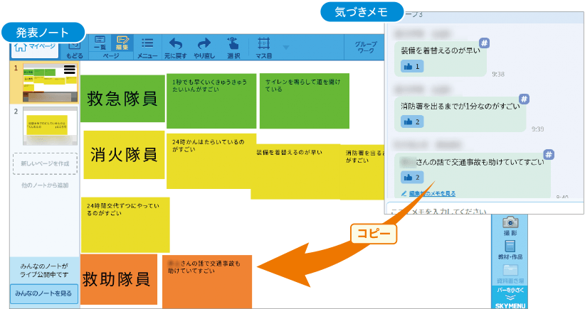 [気づきメモ]から写したいメモを選択し、[発表ノート]に付箋として貼りつけ。[グループワーク]で[発表ノート]を共有し、共同編集できるようにしました。このとき、画面を一緒に見ながら試行錯誤する姿や操作方法を教え合う姿など、協働的に整理・分類する様子が見られました。その結果、3つの専門チームごとに色分けした見やすいノートに仕上がり、その後の発表も活発になりました。