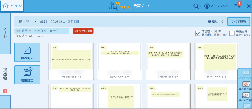 ここで苦手意識のある児童を支援するために活用したのが、[ライブ公開提出箱]です。[発表ノート]に考えを書き出す際には、あらかじめ[ライブ公開提出箱]で他者参照できるようにしておきます。本時の課題は少し難しかったかもしれませんが、友達の意見を参照しながら、考えを深める姿が見られました。
