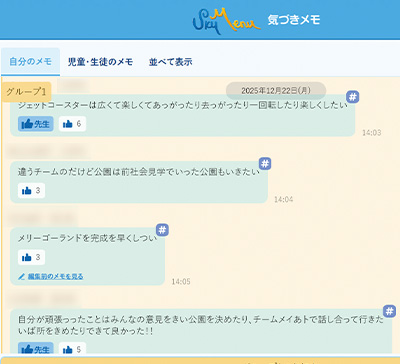 [気づきメモ]を使うと、どの単元でも子どもたちが今まで以上に意欲的に活動する様子が見られます。チャットのような画面のため、思ったことをぱっと入力しやすいのかもしれません。また、考えることに苦手意識のある児童は、友達のメモを見て考えを整理できます。逆に考えをたくさん持っている子はどんどん入力でき、待ち時間がなくなるのもメリットといえます。