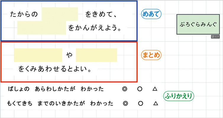 振り返りについては、記号選択方式にしました。[発表ノート]内にリンクを埋め込むことで、子どもたちが操作するページに直接アクセスできるようにしました。URLを入力したり、QRコードを読み込んだりする必要がなくなりました。操作が簡単なため、低学年の児童でもリンク先をスムーズに開けました。
