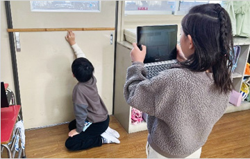 この活動は、子ども同士が2人でペアを組み、お互いに写真を撮り合い、一緒に考えました。写真を撮るときに、「この角度のほうが比べやすい」などと声を掛け合っている様子も見られました。