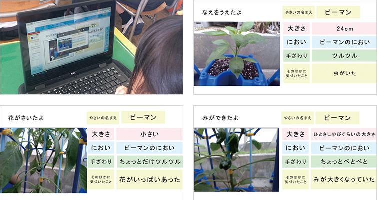 また各成長段階ごとに、定期的に記録を作成したので、子どもたちは野菜の成長を常に感じ取っていました。記録は[ライブ公開提出箱]で共有しました。同じ野菜、違う野菜の友だちの[発表ノート]と見比べることで、新たな気づきを得られたようでした。