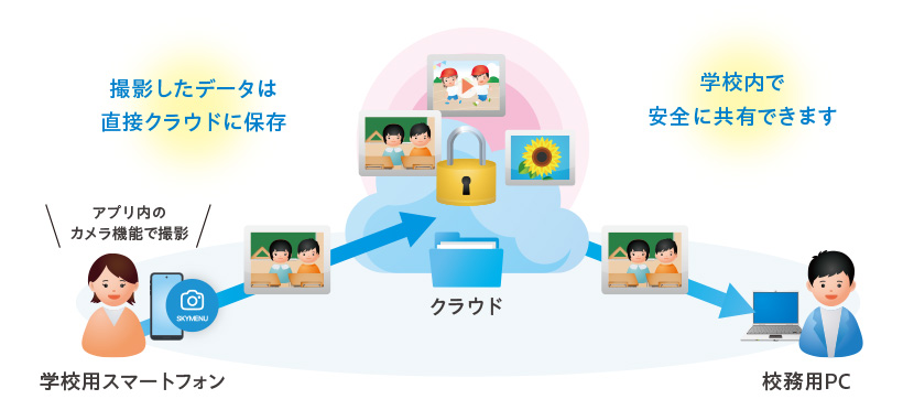 そこで、『SKYMENU Mobile』の[セーフカメラ]では、撮影した写真や動画をアプリ上から自治体指定のクラウドに直接アップロードする仕組みを採用しています。オフライン時に撮影したデータは、暗号化された状態で一時的に端末に保存され、インターネット接続時に自動でクラウドにアップロードされます。そのため、端末にデータが残らず、安全に管理できます。