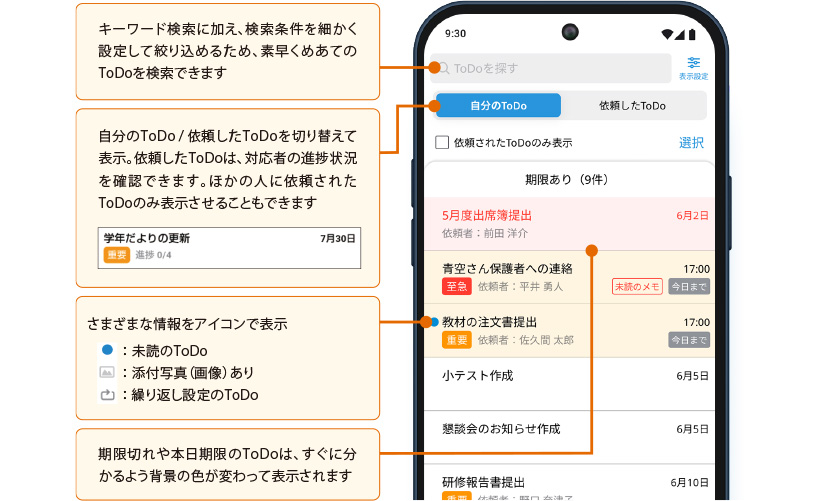 また、ほかの教職員に対してToDoを登録し、タスクを依頼することもできます。依頼された教員がToDoに対して「完了」のボタンを押すと、依頼者にプッシュ通知が届くため、タスクの進捗が確認できて安心です。