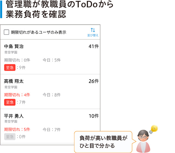 また、管理職の先生は各教職員のToDoリストをチェックすることができるので、負荷状況の把握や適切な声かけにお役立ていただけます。将来的にはAIによるToDoの分析が可能なダッシュボードの搭載を検討しており、より適切なサポートにつながる環境を整備する予定です。例えば、「至急」タグのToDoがいくつも重なっていたり、「重要」タグのタスクを多く引き受けていたりと負荷が高い教職員をグラフで視覚的に表し、業務の見直しや分散を検討する材料の一つとして活用いただけるような機能を検討しています。