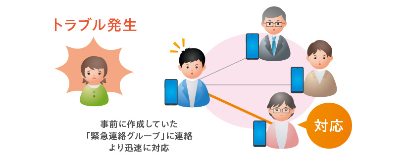 また1対1で通話できるのはもちろん、複数の教職員を指定してグループ通話をすることができます。同じ学年の教職員をグループに設定したり、校長先生や教頭先生など、すぐに連絡を取りたい相手をお気に入りに設定したりできるので、手早く連絡を取れます。