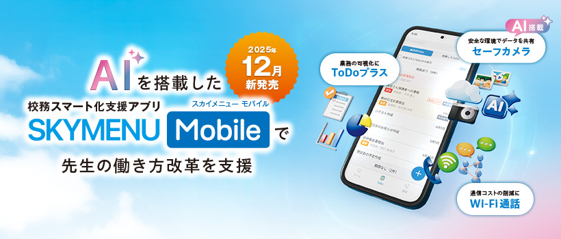 『SKYMENU Mobile』は、教育現場専用のアプリとして、先生方が安心して働ける環境の実現をめざし、今後も機能の追加や改善を重ねながら、学校における働き方改革を支援してまいります。