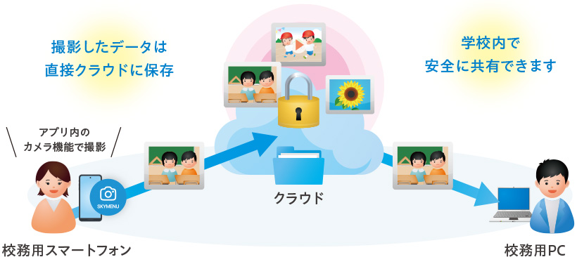 特に、『SKYMENU Mobile』のカメラ機能で撮影した写真が、自動的にクラウドに保存される[セーフカメラ]は、安全に写真を共有・管理できる、現場に即した仕組みです。